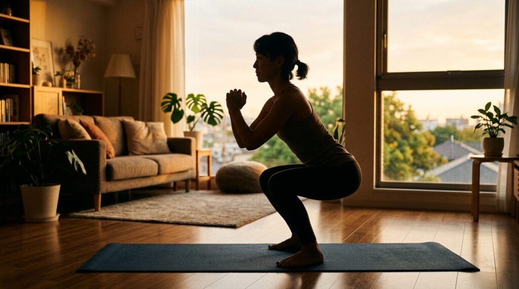 - 強度を上げたい場合: スロースクワット(3秒かけて下ろす)またはジャンプスクワット