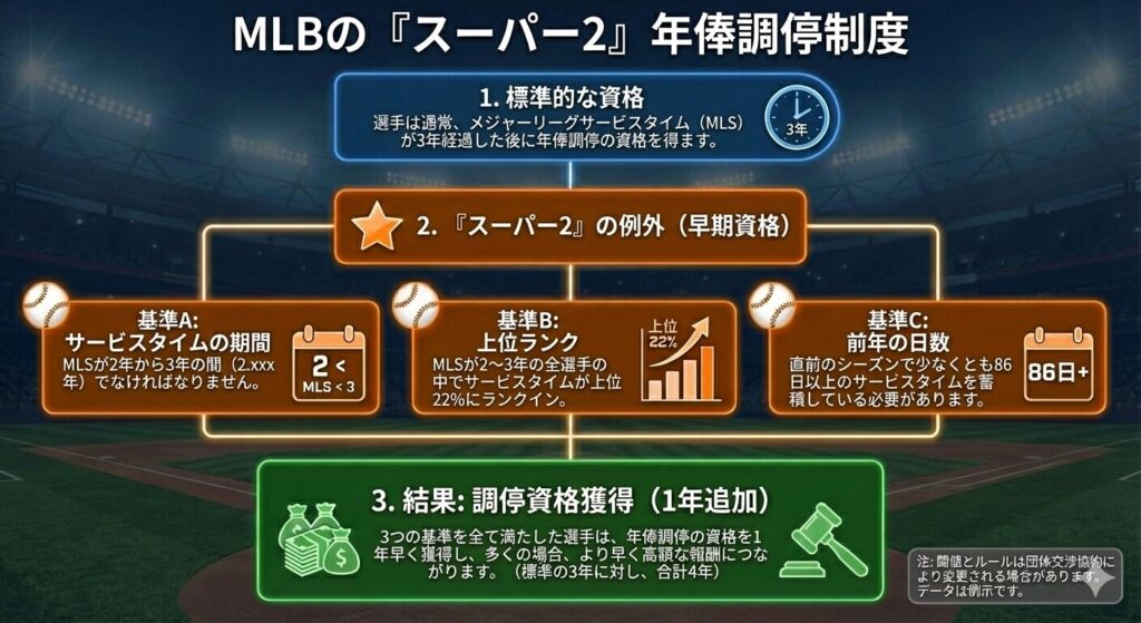 - MLS2-3年の例外規定「スーパー2」になると年俸調停権資格保有期間が4年になる。